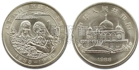 1988年,央行正式发行“宁夏回族自治区成立三十周年纪念币”,俗称“宁夏币”,发行量仅有156万枚。也正因如此,虽然宁夏币不是我国五大自治区中最早发行的,但却是市场表现最好的。