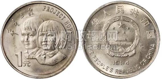 “希望工程实施5周年”纪念币,其正面既有中文的“希望工程”,又有英文的“project hope”,实属不多见。