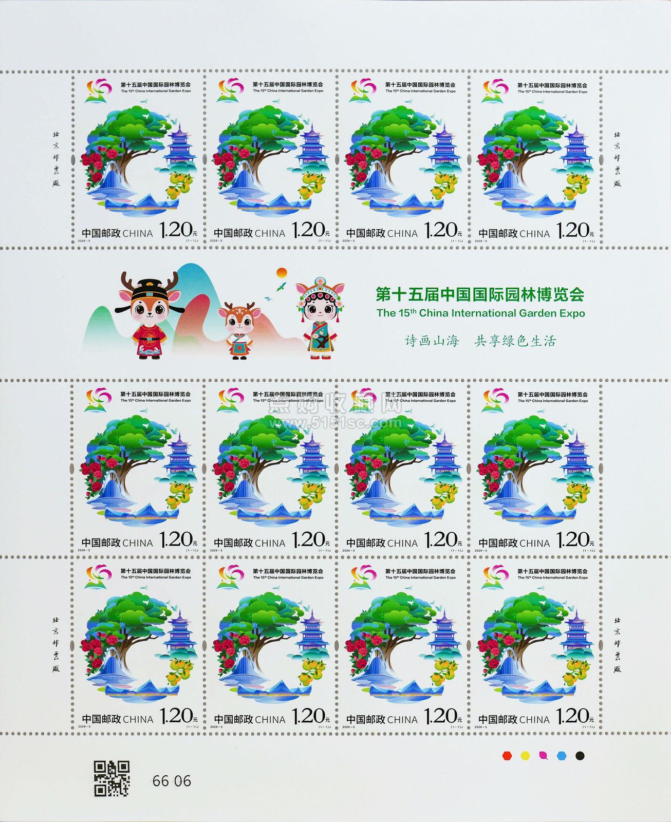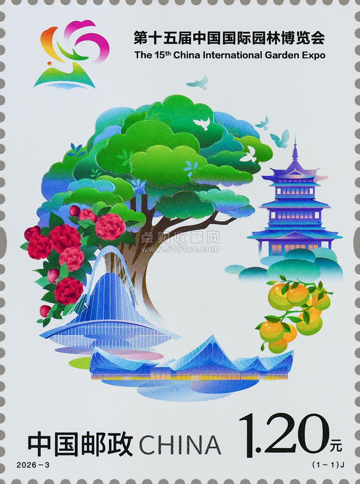 中国邮政定于2026年4月15日发行《第十五届中国国际园林博览会》纪念邮票1套1枚。邮票图案名称为:第十五届中国国际园林博览会。全套邮票面值1.20元。计划发行数量为420万套。