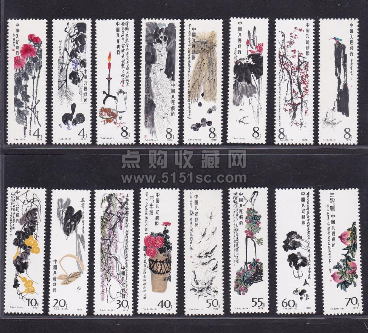 1980年,中国邮政发行了《齐白石作品选》特种邮票,这是第一套以“某某”作品选命名的邮票,为之后的名家作品选系列打开了先河。《齐白石作品选》全套邮票共16枚,精选了齐白石作品中的十六幅绘画。动物、植物、山水等等,应有尽有,概括地体现了齐白石的艺术成就。