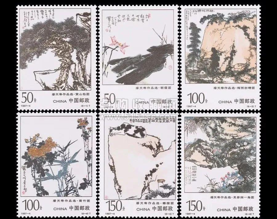 1997年,为了纪念潘天寿先生诞生一百周年,中国邮政发行了《潘天寿作品选》特种邮票,全套6枚。邮票画面分别表现的是:黄山松图、朝霞图、梅雨初晴图、菊竹图、睡猫图和灵岩涧一角图,这套邮票的6幅画面均为画家五六十年代的佳作。
