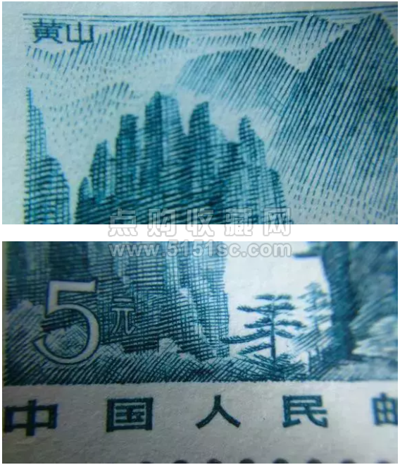 黄山 5元,发行。黄山古称“黔山”,唐时改称黄山。在安徽省南部,是我国著名的风景区和旅游胜地。明代旅行家徐霞客曾说:“五岳归来不看山,黄山归来不看岳。”峰峦叠嶂,奇峰怪石,云雾缭绕,都为他处所不见,配上黄山松,构成奇、险、深、幽等奇景。