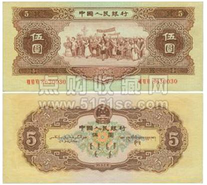 在二版币中,有2种版本的伍圆,分别是1953年版的红五圆,和1956年版的黄五圆。