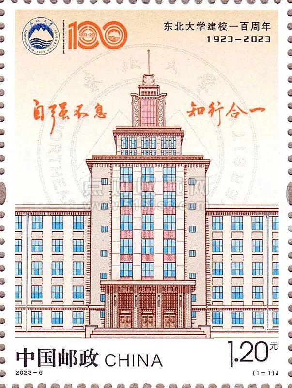 2023年发行《东北大学建校一百周年》纪念邮票,邮票以东北大学标志性建筑正面为主景,建筑的筋骨采用雕刻线条表现,以点和线的形式绘制百年征程波澜壮阔的东北大学,在几何形的构图中强调造型之美、对称之美。背景色采用淡黄色渐变,给人以朝阳初起蓬勃向上的感觉,又带给观者古色古香的书卷之气,使百年东北大学的文化气息扑面而来。建筑背后衬托东北大学校徽线条,提升了整体画面感和构图的一致性。图案上方左右角各摆放东北大学校徽、东北大学建校百年LOGO及文字说明。主体建筑上方两侧摆放校训,指明了东北大学师生的努力方向和行为规范,增强了整体构图的空间感。