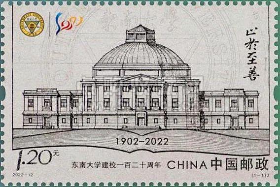 2022年发行《东南大学建校一百二十周年》纪念邮票,邮票以东南大学早期大礼堂的手绘建筑图为核心元素,下方以展开的书本、建校时间等为烘托,寓意“百廿名校、教书育人”,背景为东南大学标志的标准制图,与校徽、“120”校庆标志、校训等元素协调搭配,整体画面结构严谨、色调沉稳厚重,衬托出百廿名校的悠久历史与深厚底蕴。
