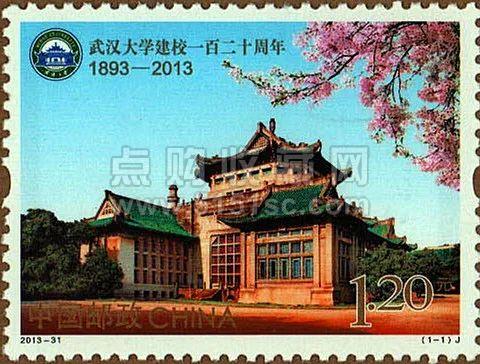 2013年发行《武汉大学建校一百二十周年》纪念邮票,邮票构图以中西合璧宫殿式的武大老图书馆为主体,青色的琉璃瓦,腾飞的屋檐,在绿树环绕、樱花点缀的环境中,将自然环境与人文底蕴高度融合,很好地体现了武大的活力。