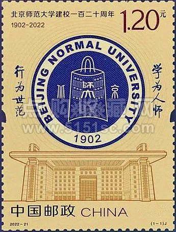2022年发行《北京师范大学建校一百二十周年》纪念邮票,邮票以北师大校徽标志为主体内容,同时辅以“学为人师,行为世范”校训、学校主楼等元素,并以环绕校徽的圆形细线为背景,寓意北师大“木铎金声,弦歌不辍”的余韵和着时代节拍不断激荡传播,整体画面构图饱满、层次分明,突出体现了北师大的办学精神和使命担当。
