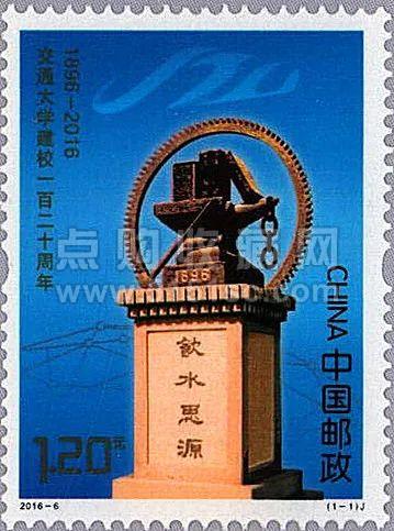 2016年发行《交通大学建校一百二十周年》纪念邮票,邮票以交通大学校徽的“饮水思源”纪念碑为主图,背景的蓝色渐变彰显了交大人海纳百川、放眼世界的胸怀和抱负,上下链接的网格体现了“天地交而万物通”的厚重底蕴。