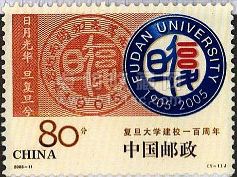 2005年发行《复旦大学建校一百周年》纪念邮票,邮票以复旦大学学校标志和百年校庆标志两个圆形徽记部分重叠为主图,加上左侧竖印“日月光华旦复旦兮”的金色字条,构成“100”的整体数字图形,点明“复旦大学建校一百周年”的主题。