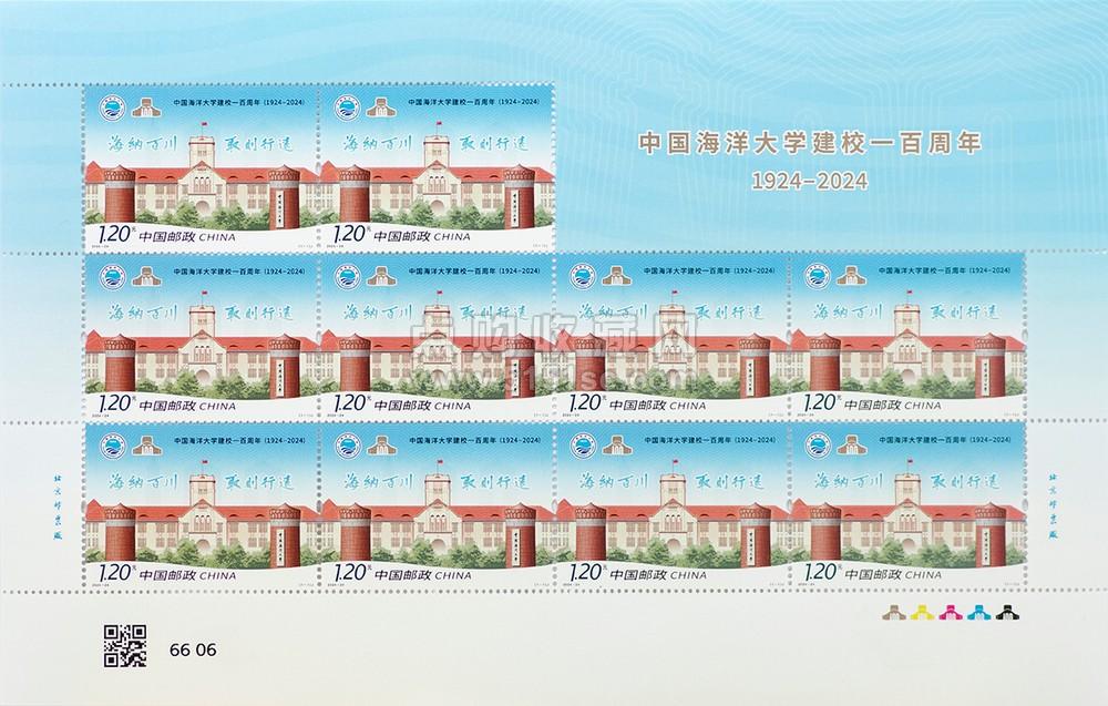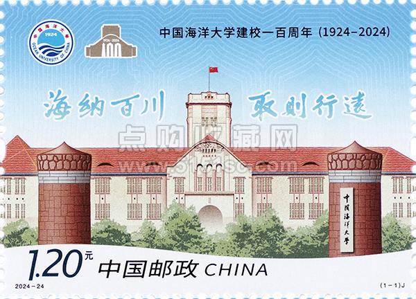 2024年10月25日发行2024-24J《中国海洋大学建校一百周年》纪念邮票一套1枚,面值1.20元,邮票规格50×36毫米,陈景异、夏竞秋设计,采用胶印工艺印制,整张枚数10枚。