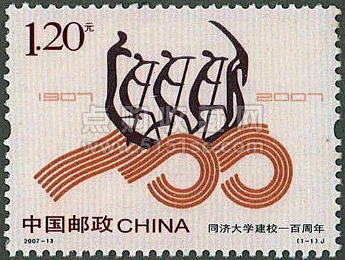 2007年发行《同济大学建校一百周年》纪念邮票,邮票以同济大学新校徽“三人划龙舟”的标志图案为主图,昭示着同济大学“三人成众,同舟共济,向着一流目标奋力”的拼搏目标,龙舟下面的波浪变形为“100”字样,突出了建校百年的含义。