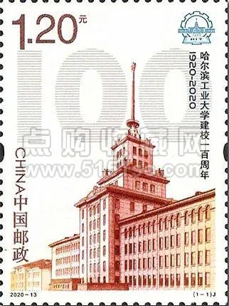 2020年发行《哈尔滨工业大学建校一百周年》纪念邮票,邮票以庄严、厚重的哈尔滨工业大学主教学楼为主体,设计构图严谨、层次简练有序,白色的背景衬托出雄伟壮丽的欧式教学楼建筑,凸显出哈工大悠久的历史、深厚的底蕴和辉煌的成就。