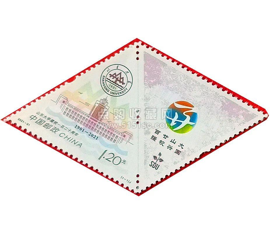 2021年发行《山东大学建校一百二十周年》纪念邮票,邮票创新性地采用平行四边形构图和左右分布的格局,形成“一票双图”的视觉效果,左侧画面以山东大学“图书馆”“知新楼”为主体,右侧画面以120周年校庆标识为主体,并衬以山大人熟悉亲切的校园环境作为背景,并采用棕、金双色雕刻的顶级邮票印制工艺,以全新的画面、精湛的工艺,深入诠释出山东大学深厚的历史底蕴和鲜明的文化特色。