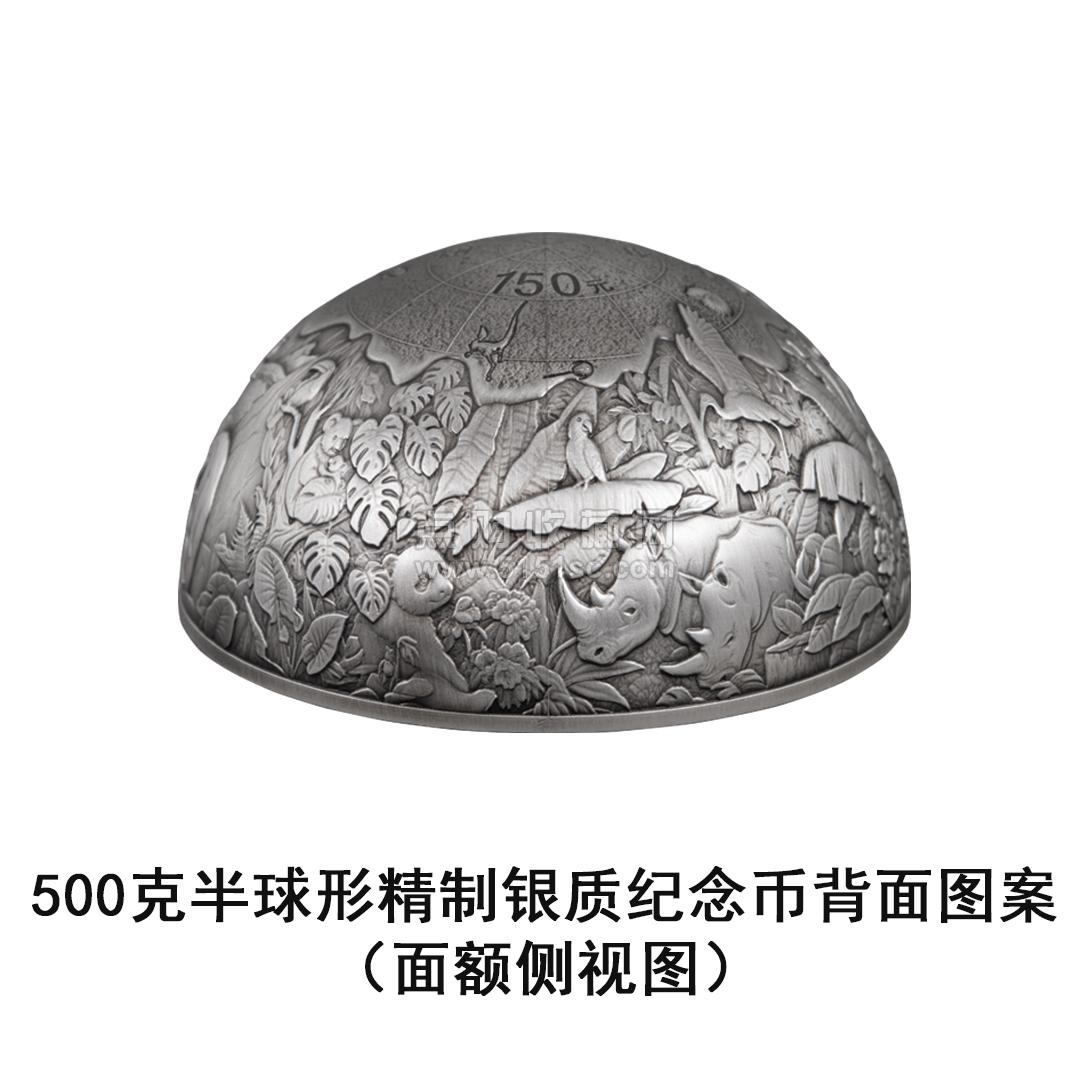 500克半球形银质纪念币背面图案为地球动植物代表性物种,以及化石、经纬线等组合设计,并刊“守护地球家园”字样及面额。