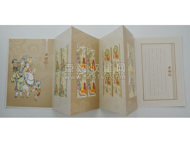 该邮品由邢文伟设计,四方连邮票折规格114×164毫米,面值21.60元,采用竖版。《西游记》四方连风琴折首次加入小型张。