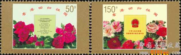 1997年7月1日,中华人民共和国政府对香港恢复行使主权,香港的历史从此翻开了新的篇章。随着基本法的全面贯彻落实,香港将保持长期繁荣稳定,“东方之珠”必将迸发出更加夺目的光彩。         全套共2枚。
