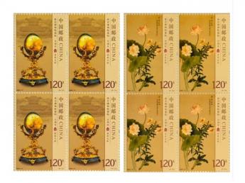 邮票采用高精度胶版工艺印制,体现出文物的质感和古画的韵味。一图的“金嵌珍珠天球仪”造型独特,工艺精湛。二图的“千年和合轴”背景细腻柔和,渐变过渡自然。边饰使用特种金属质感油墨,上方的标题和宫标与下方的海水江崖图案相得益彰。在紫外灯照射下,荧光效果在提升邮票防伪性能的同时,提高了邮票的美观性。