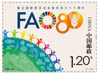中国邮政定于2025年10月16日发行《联合国粮食及农业组织成立八十周年》纪念邮票1套1枚。详情如下: