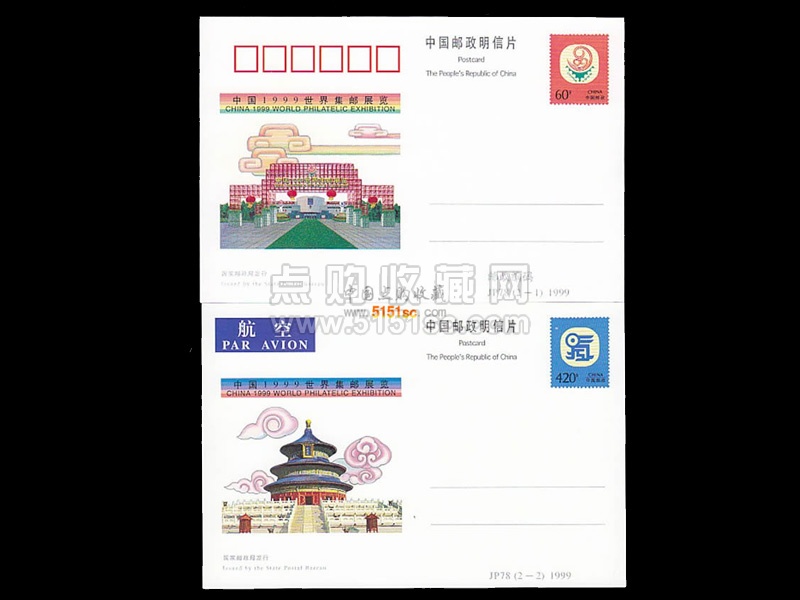 1999年8月21日至30日中国1999世界集邮展览在北京举行,1999年5月26日国家邮政局发行了纪念邮资明信片一套2枚。第一枚邮资图是展徽,邮展展徽上方为3个“9”组成的祥云,下方为象征中国邮政和集邮的邮票齿孔和长城图案。两侧为“中国1999”字样。片图是世界邮展场馆外景。第二枚邮资图是吉祥物,邮展吉祥物取自中国神话传说中的玉兔。片图是天坛祈年殿,天坛祈年殿不仅是中国的著名建筑,而且已被列为联合国世界文化遗产,成为世界著名的建筑。