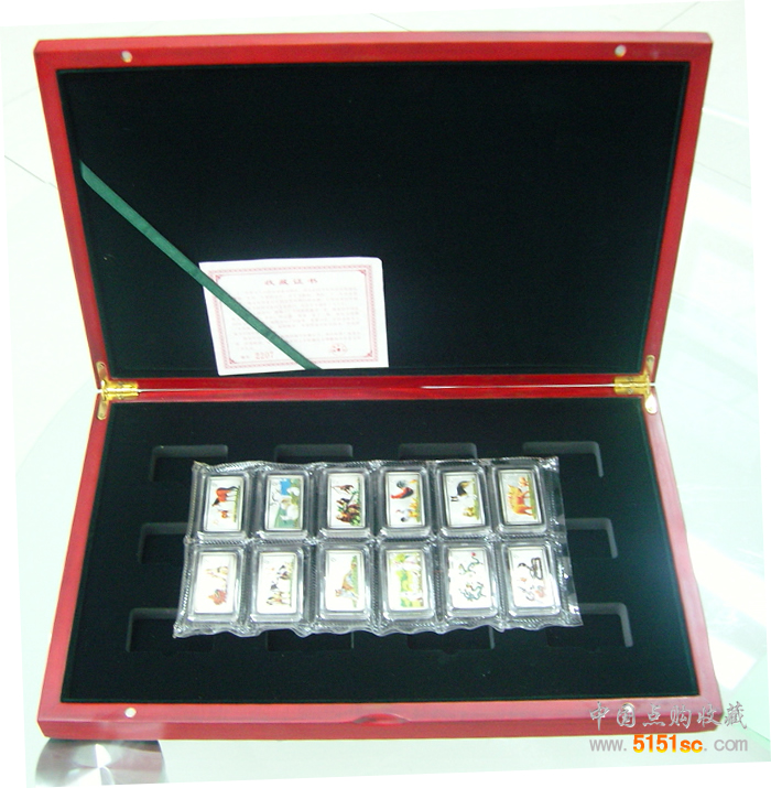 今天由上海造币厂精制十二生肖彩色银章一套,即时对中国传统文化的尊崇,更是一种弘扬。银章一套十二枚。每枚含纯银银Ag99.9%,长方形、规格是38*20毫米,重量12克。正面分别为十二生肖图,形态各异,惟妙惟肖,并采用现代彩印技术;背面图案为中国传统吉祥图案。