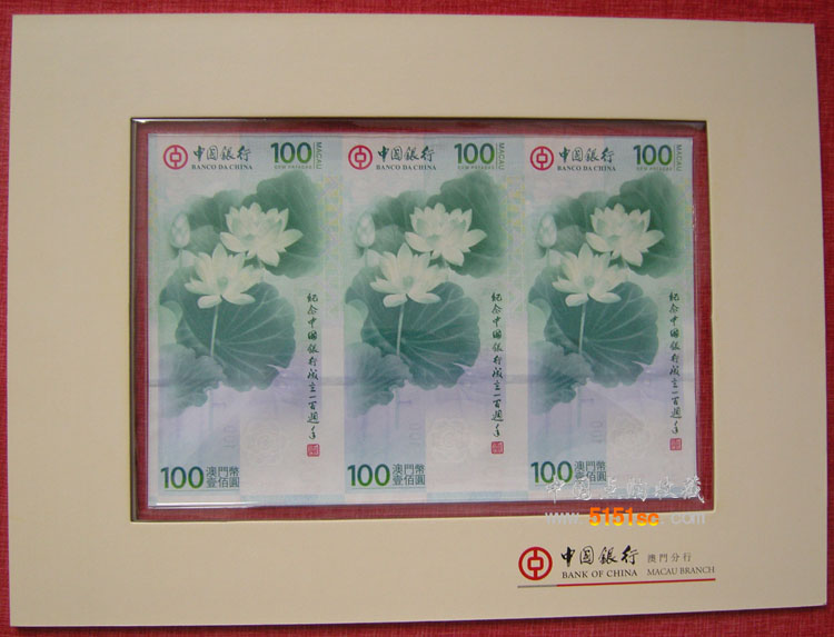 【藏品名称】中国银行100周年纪念钞三连体(澳门荷花钞三连体)