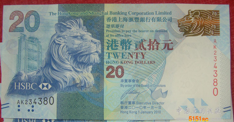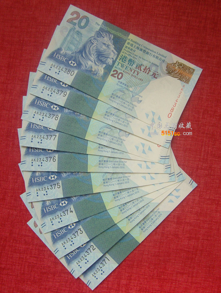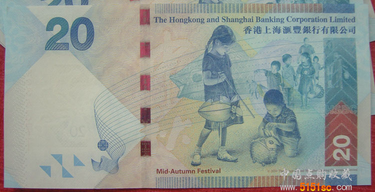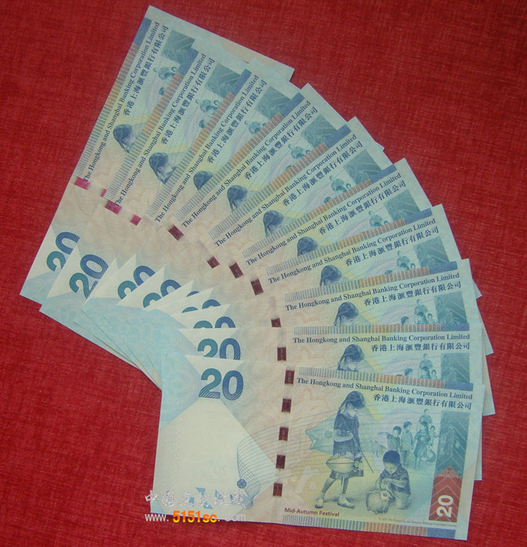 【藏品名称】香港上海汇丰银行港币20元(中秋纪念钞)10张连号