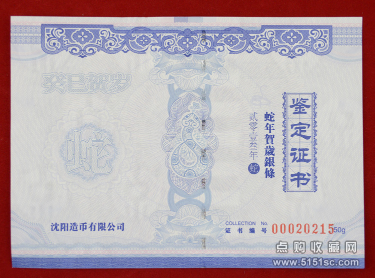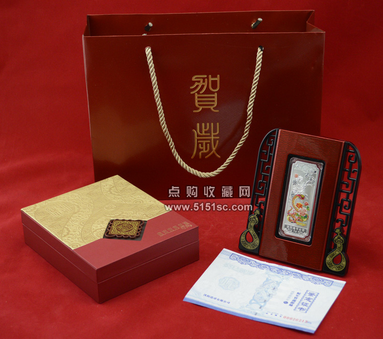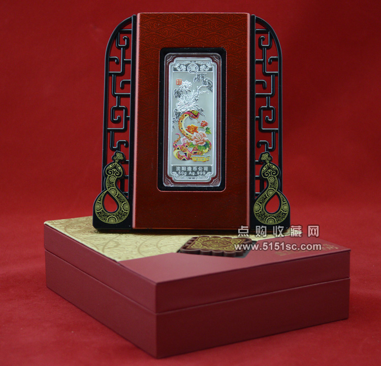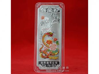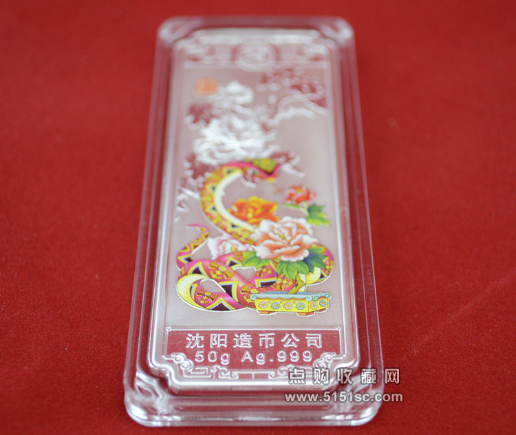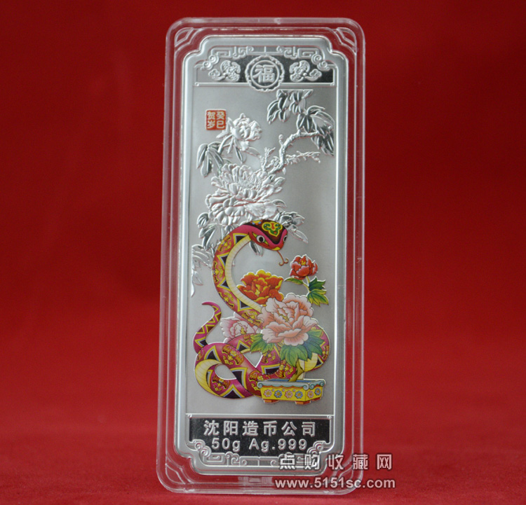 蛇年贺岁彩色银条,每套1枚,规格80*30毫米。成色Ag.999,含纯银50克,限量发行150000套。成色标准,重量合格,质量精制。