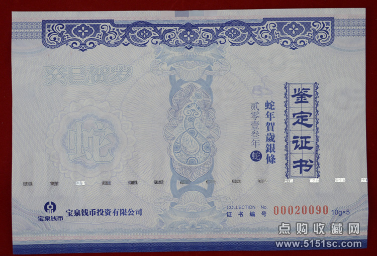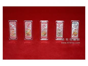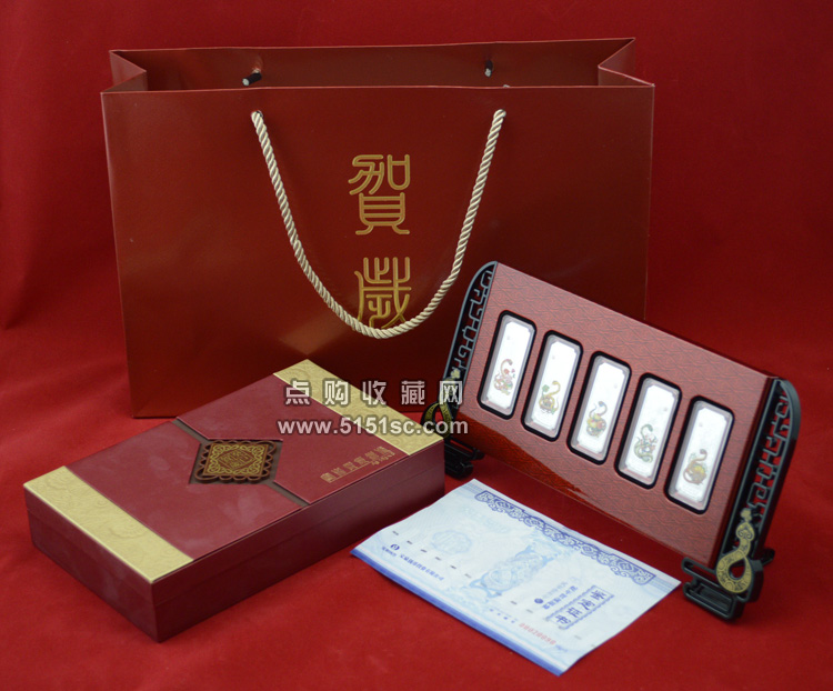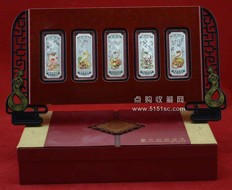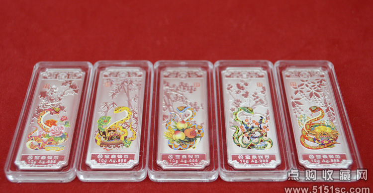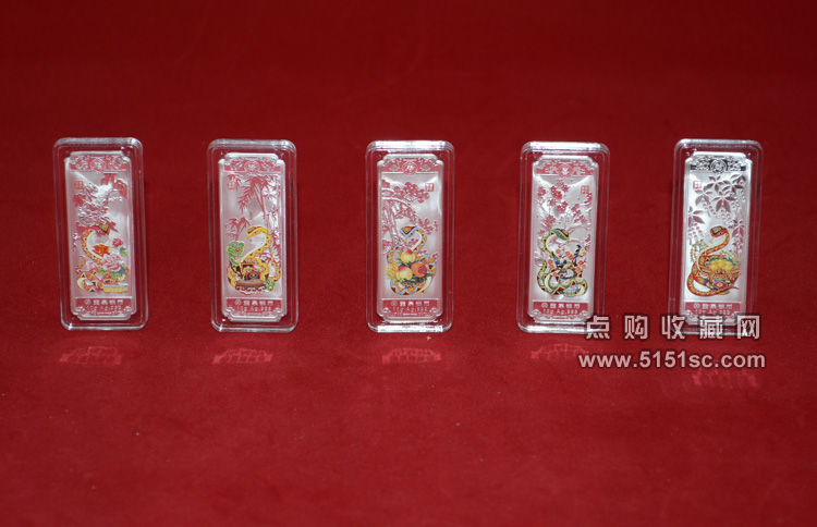 蛇年贺岁彩色银条套装。每套5枚规格52*19.2毫米,成色Ag.999,含纯银50克,限量发行100000套。成色标准,重量合格,质量精制。