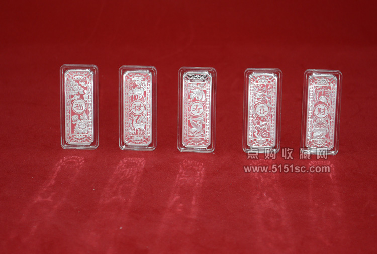 “福禄寿喜财”蛇年贺岁彩色银条由沈阳造币有限公司(原沈阳造币厂)铸造发行。 蛇年贺岁彩色银条套装,正面为五条彩蛇分别盘踞于象征“福禄寿喜财”的牡丹、如意、蟠桃、喜梅、财宝之间;背面分别书“福”禄“寿”“喜”“财”五字于蝙蝠、鹿、仙鹤、喜鹊、金蟾等吉祥元素间。