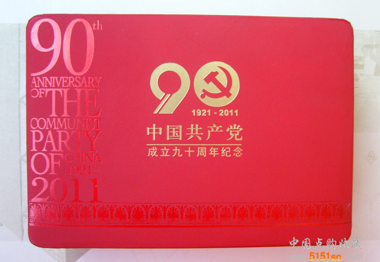 银条正面图案是“90”“1921-2011中国共产党成立九十周年纪念”字样。左右共十面红旗排开,下方鲜花簇拥,寓意着建党九十周年纪念活动的隆重盛大;背景是勾线牡丹,象征着繁荣美好。背面鲜艳的党旗迎风飘扬,下方是中共一大会址和中国共产党诞生地浙江嘉兴南湖红船。中国共产党成立九十周年彩色纪念银条材质为999纯银30克,限量发行20000套。
