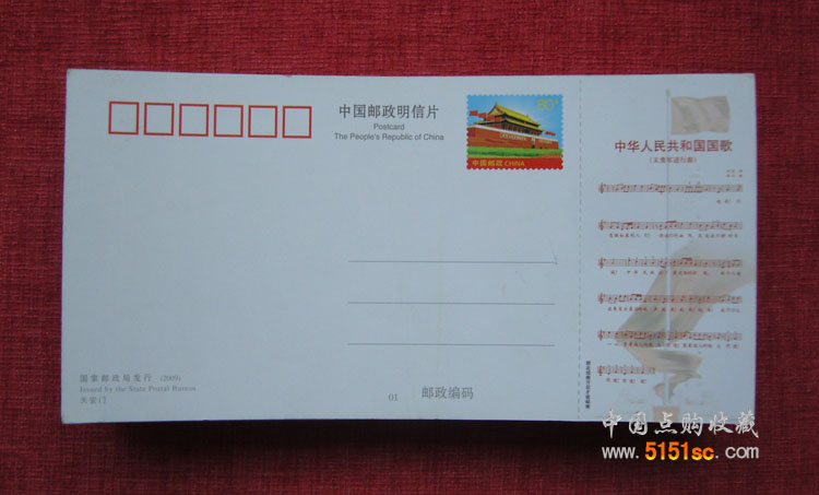 该套片共4枚,分别为:09-110105-11-6046-001(天安门横错片);09-110105-11-6046-002(广场横错片);09-110105-11-6046-003(天安门竖错片);09-110105-11-6046-004(广场竖错片)。每枚有邮资的一面都印有中华人民共和国国歌《义勇军进行曲》,其歌谱为五线谱,其中:1、有7个音符出错(后果:按该谱奏出的绝非“中华人民共和国国歌”)2、有7个休止符出错(后果:完全改变了中华人民共和国国歌的节奏)其他:漏印渐强符号;漏印3连音符号。总之,是错得一塌糊涂。